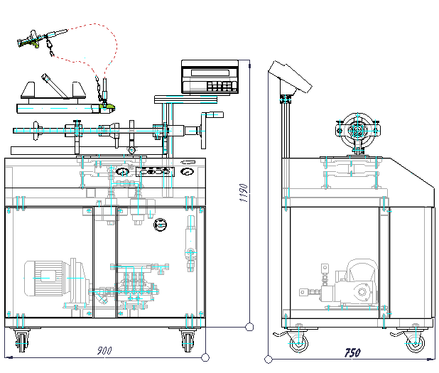 Die Anlage besteht aus einer elektrisch betriebenen Füllpumpe, zwei direkt gesteuerten Magnetventilen, Manometern, Sicherheitsventil und einer digitalen Wiegeeinrichtung. Auf dieser ist ein Universal-Füllkopf mit Schnellspannvorrichtung aufgebaut. Damit können sämtliche am Markt befindliche CO2-Flaschen schnell und sicher eingespannt und befüllt werden. Für jede Ventil-Konstruktion der innenliegenden CO2-Flaschen ist ein passender Schlüsseleinsatz erforderlich. Diese CO2-Flaschen werden in der Regel am Flaschenhals abgedichtet. Passende Spezial-Füllkopfflansche für Sonderformen und für kleinere Patronen sind lieferbar.